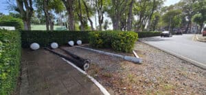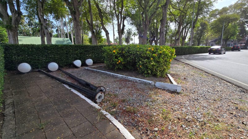 Aan de oostzijde van het Presidentieel Paleis en wel voor de haag langs de weg, liggen deze lantaarnpalen inclusief lampen, al enige tijd op een onbewaakte wijze. Hoorde allemaal bij de verlichting van het Onafhankelijkheidsplein. We nemen niet aan, dat ze daar gereed liggen, om door dieven weggedragen te worden. Maar het kan nimmer zo zijn dat men nog bruikbaar staatsbezit, zomaar achteloos en onbewaakt, deponeert en dat voor niet korte tijd.